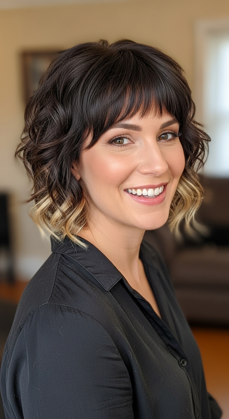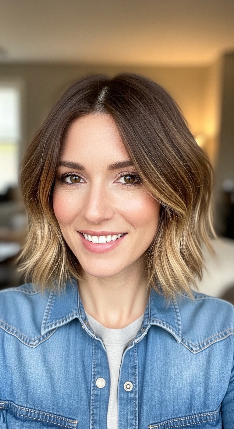 Der kurze Lob kombiniert die Eleganz mittellanger Haare mit der Frische kurzer Schnitte. Balayage setzt feine Highlights, die das Gesicht sanft umrahmen und den Look sofort aufwerten.