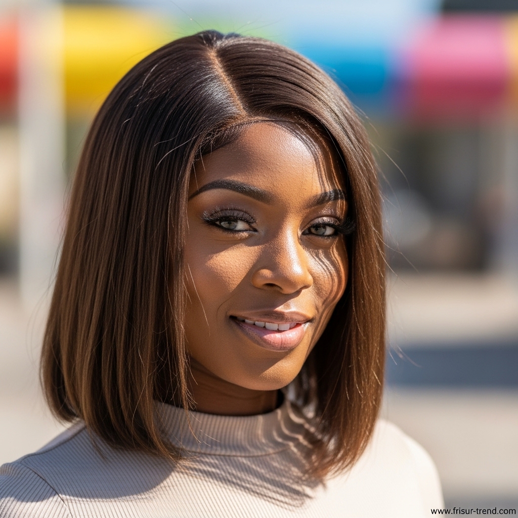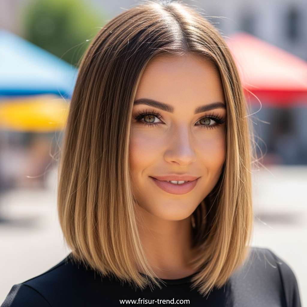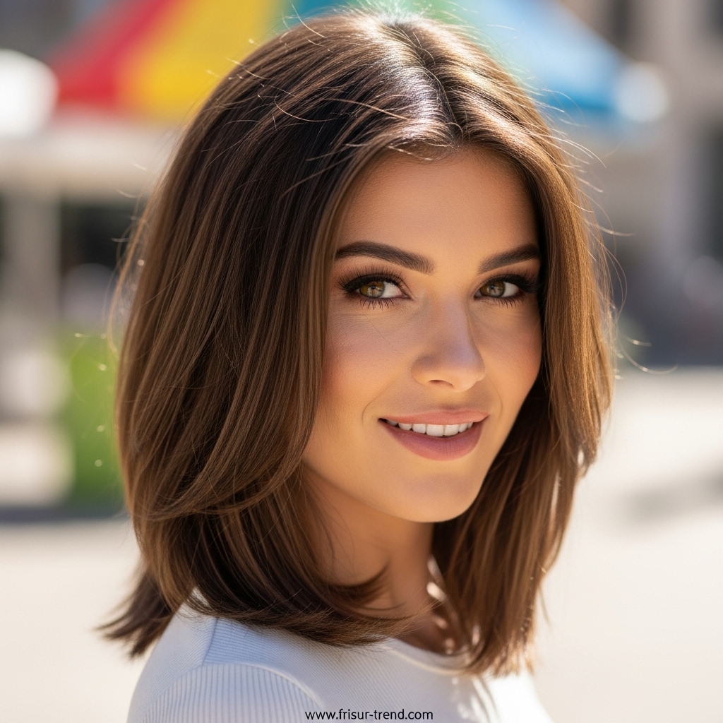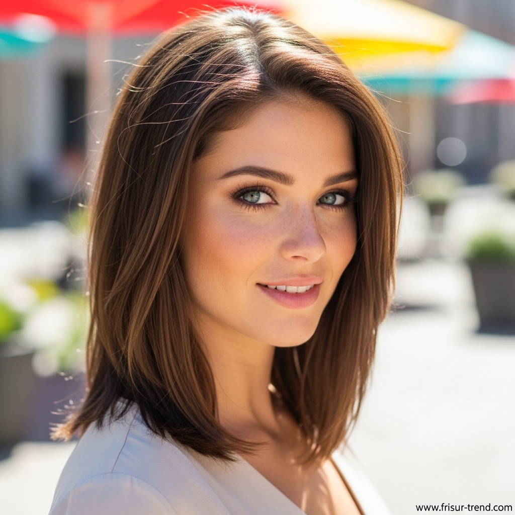 Diese Frisur zieht Blicke an, ohne übertrieben zu wirken. Sie signalisiert, dass die Trägerin Wert auf ihre Erscheinung legt, ohne aufdringlich zu sein. In der Modewelt gilt glattes, mittellanges Haar als idealer Rahmen für Gesichter jeder Form. Ob oval, herzförmig oder rund – die glatte Struktur bringt die Gesichtszüge besonders gut zur Geltung.