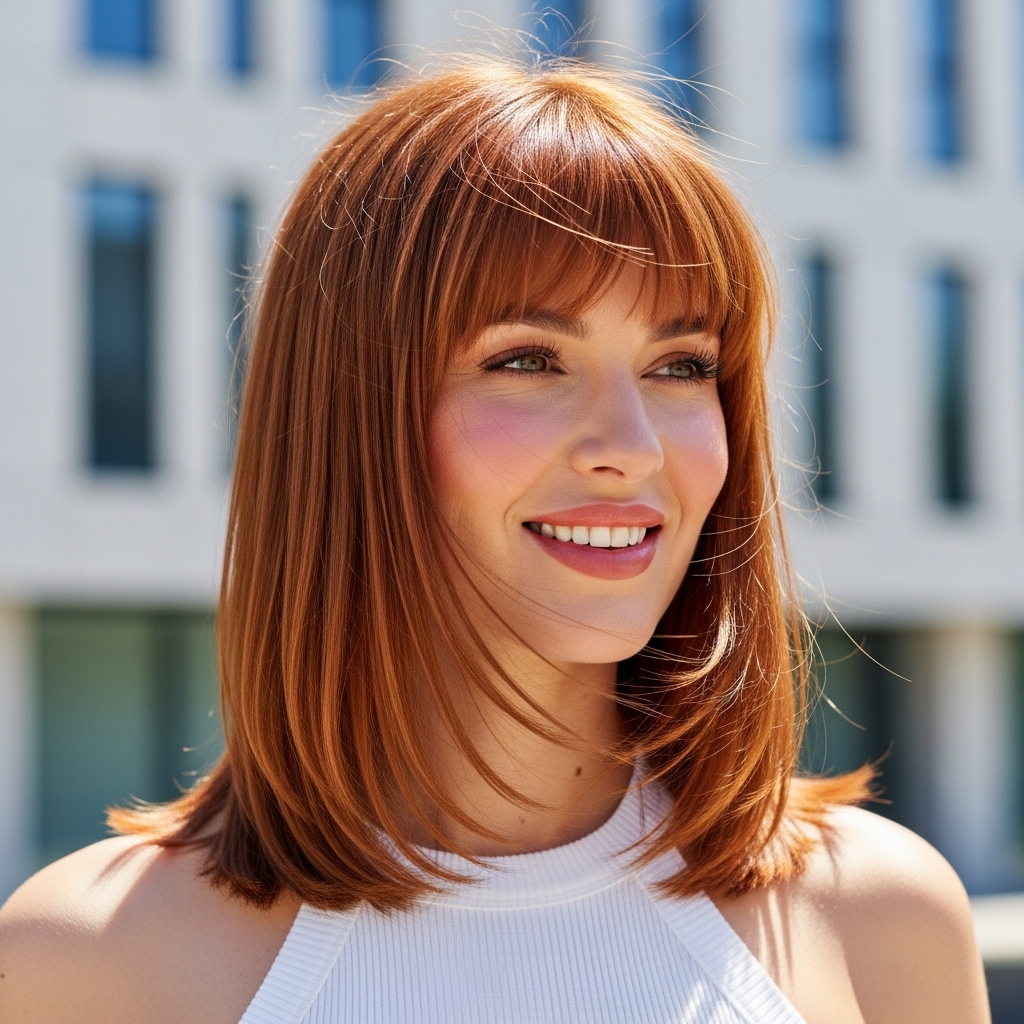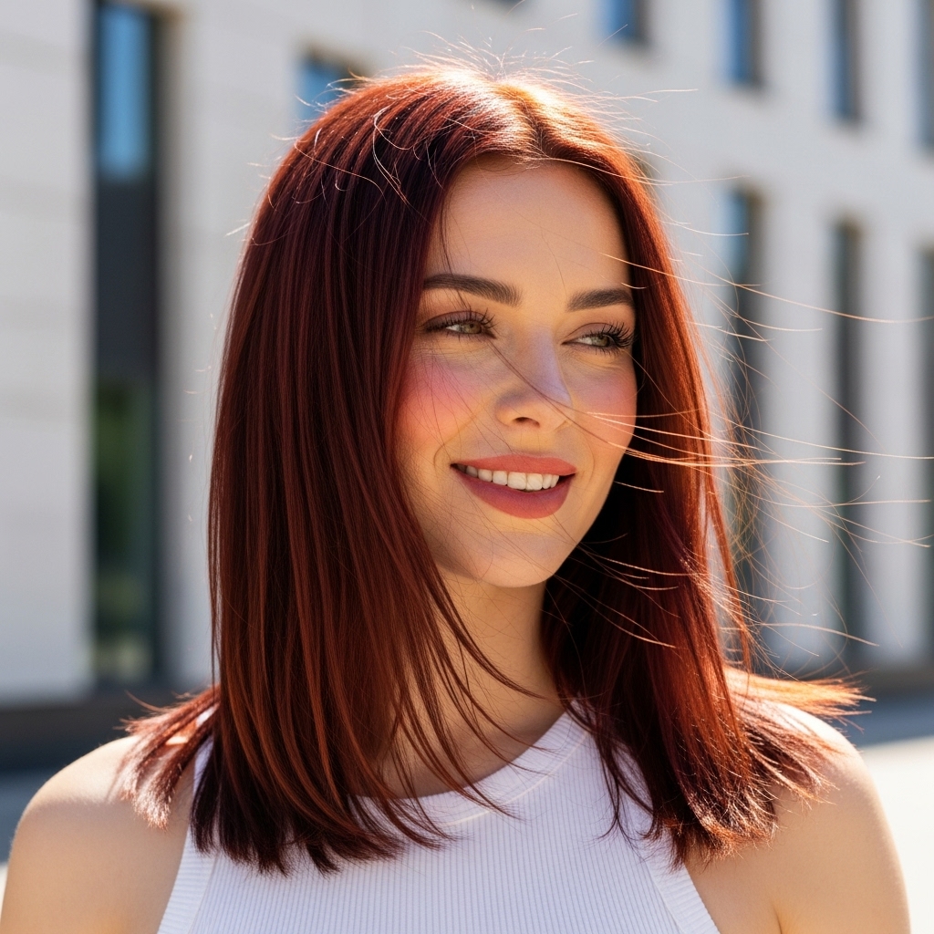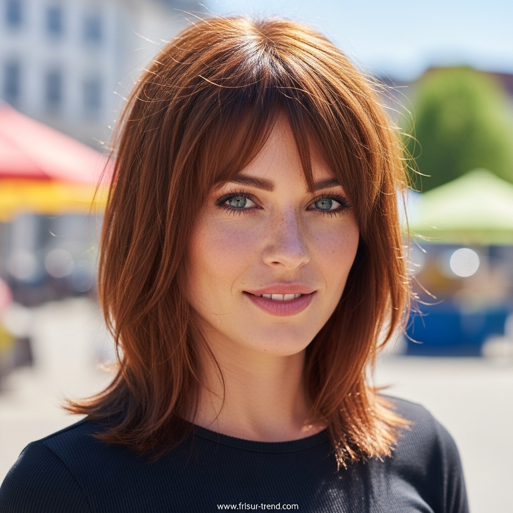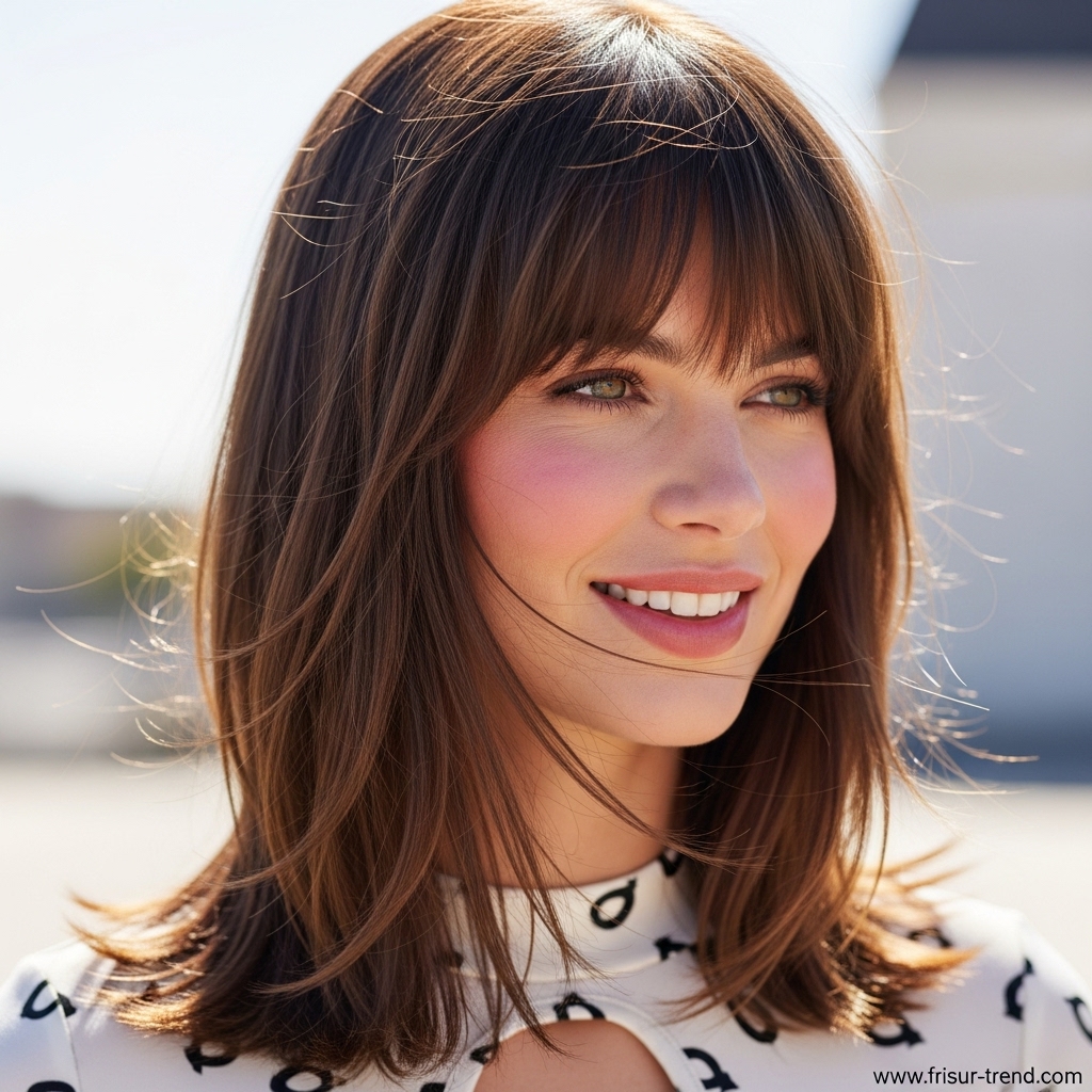 Diese Frisur zieht Blicke an, ohne übertrieben zu wirken. Sie signalisiert, dass die Trägerin Wert auf ihre Erscheinung legt, ohne aufdringlich zu sein. In der Modewelt gilt glattes, mittellanges Haar als idealer Rahmen für Gesichter jeder Form. Ob oval, herzförmig oder rund – die glatte Struktur bringt die Gesichtszüge besonders gut zur Geltung.