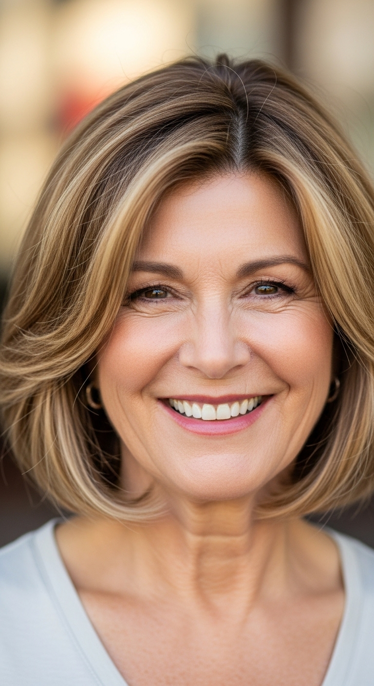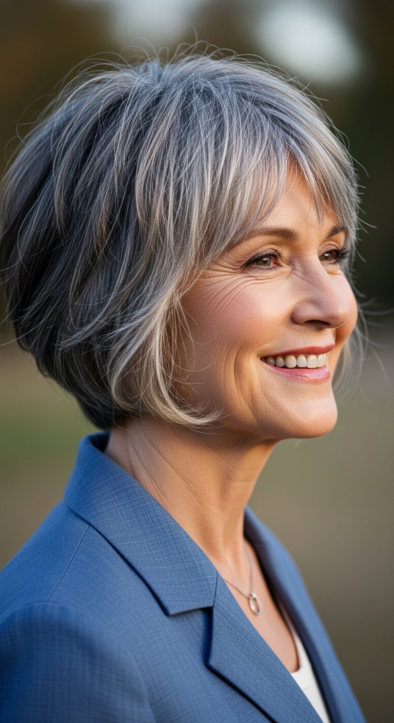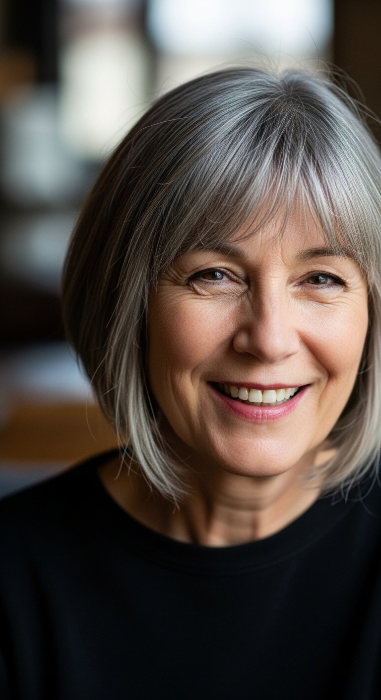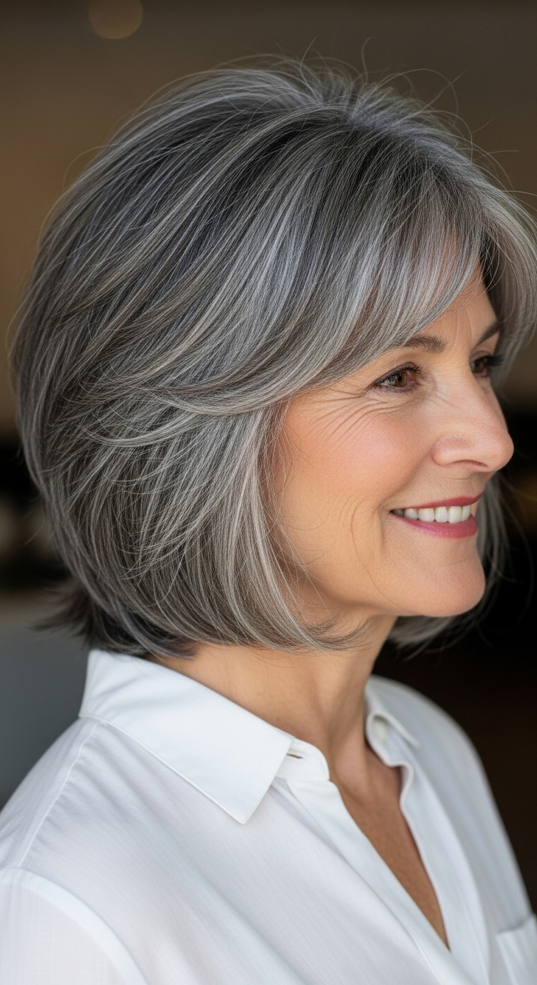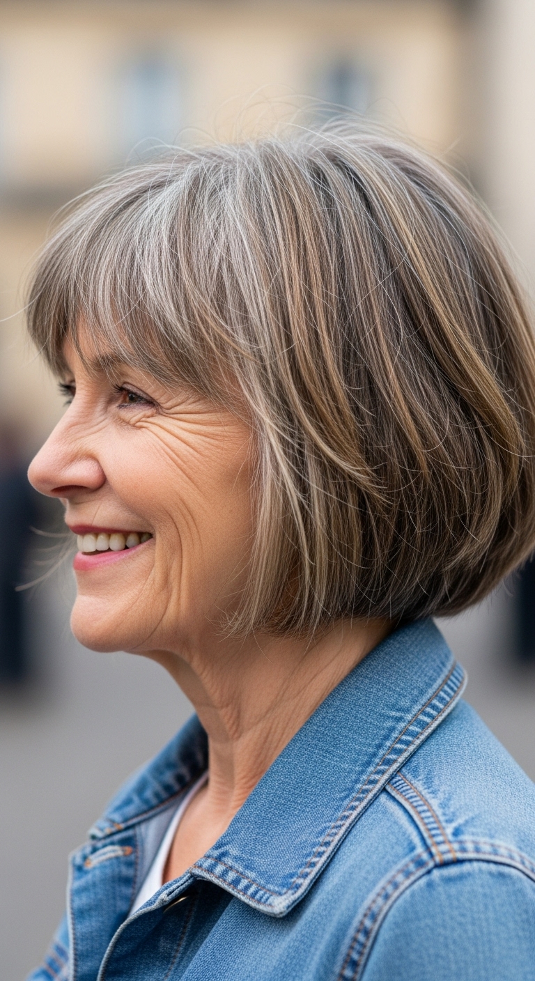 Der Bob ist seit Jahrzehnten ein Klassiker – und das aus gutem Grund. Für Frauen ab 60 ist er ideal, da er vielseitig gestylt werden kann. Ein gestufter Bob bringt Bewegung ins Haar, während ein A-Linien-Bob das Gesicht optisch streckt und jünger wirken lässt.