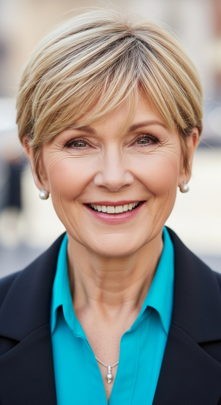 Auch der Kurzhaarschnitt mit längerem Pony ist eine elegante Option. Ein seitlich getragener Pony kaschiert kleine Fältchen auf der Stirn und sorgt für eine jugendliche Dynamik. Frauen mit dünnem Haar profitieren zudem von einem gestuften Kurzhaarschnitt, da dieser optisch mehr Volumen schafft.