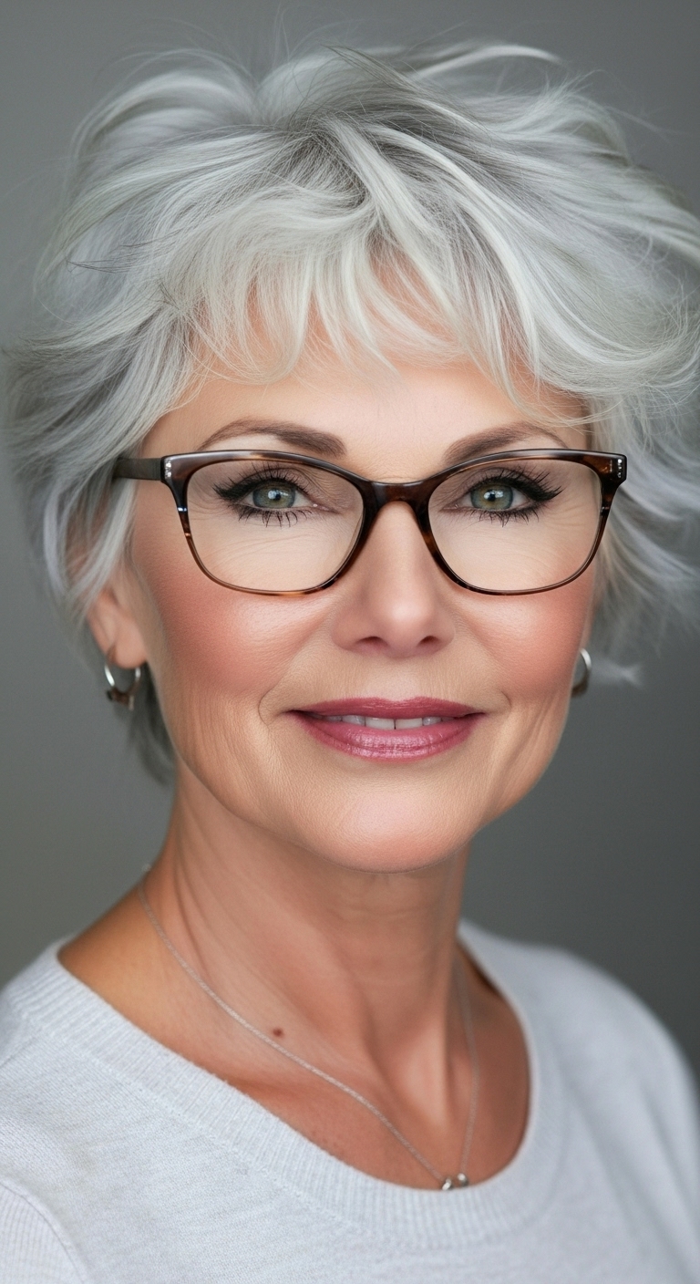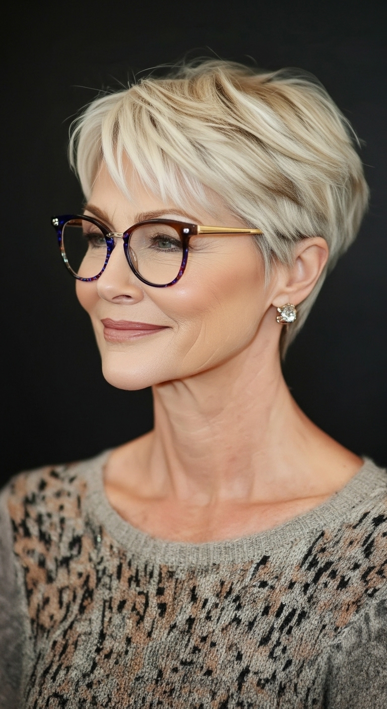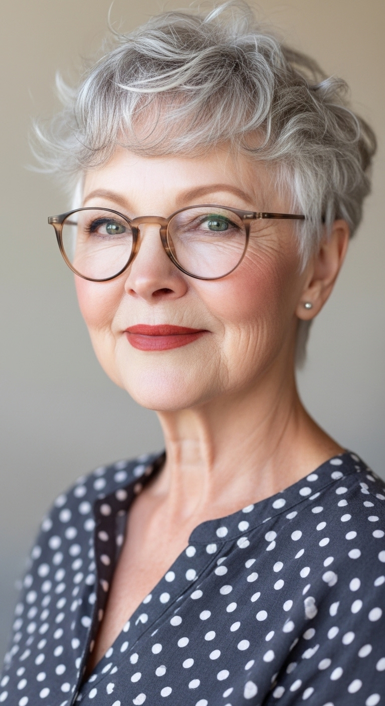 Kurzhaarfrisuren ab 60 mit Brille kombinieren Stil, Modernität und Selbstbewusstsein.