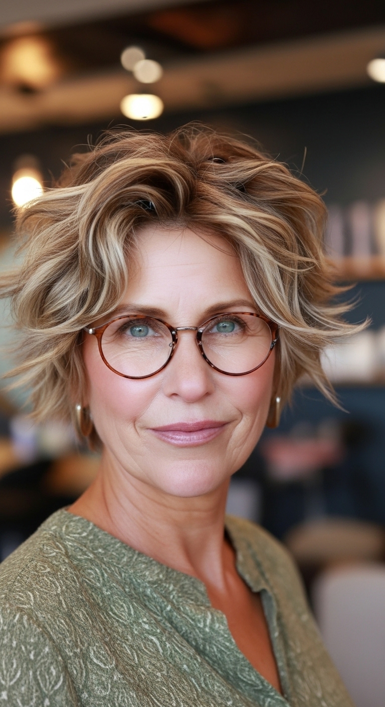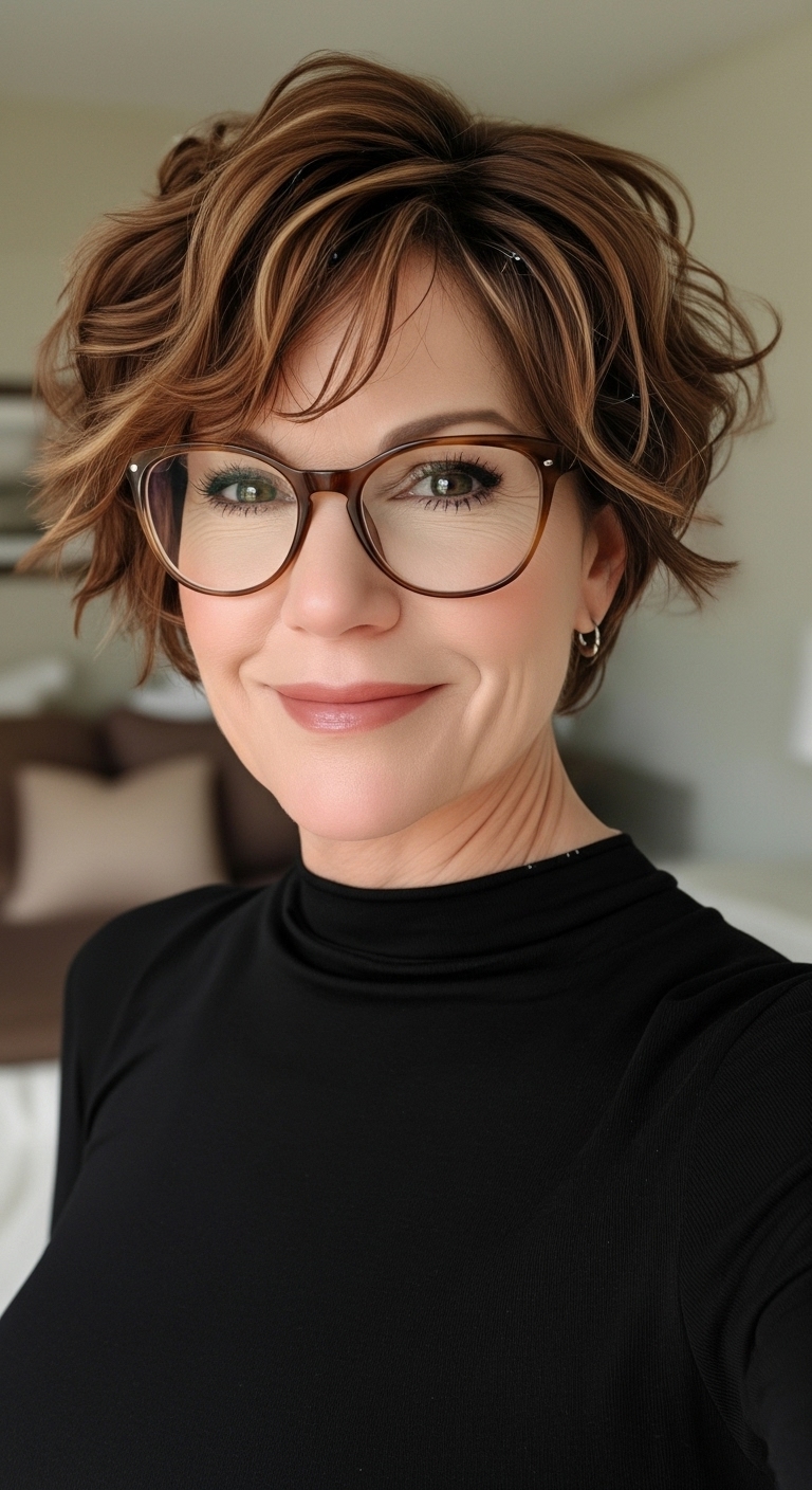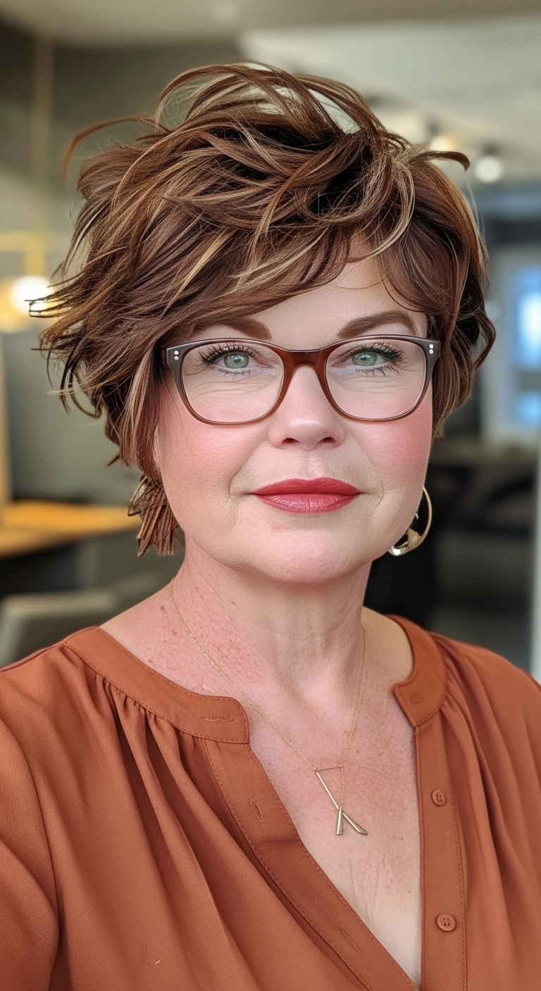 Fransige, leicht unordentliche Schnitte verleihen Dynamik und Kreativität. Der Shag ist perfekt für selbstbewusste Frauen, die sich von klassischen Frisuren abheben möchten. Freche Kurzhaarfrisuren ab 60 mit Brille in dieser Variante wirken sowohl modern als auch stilvoll.