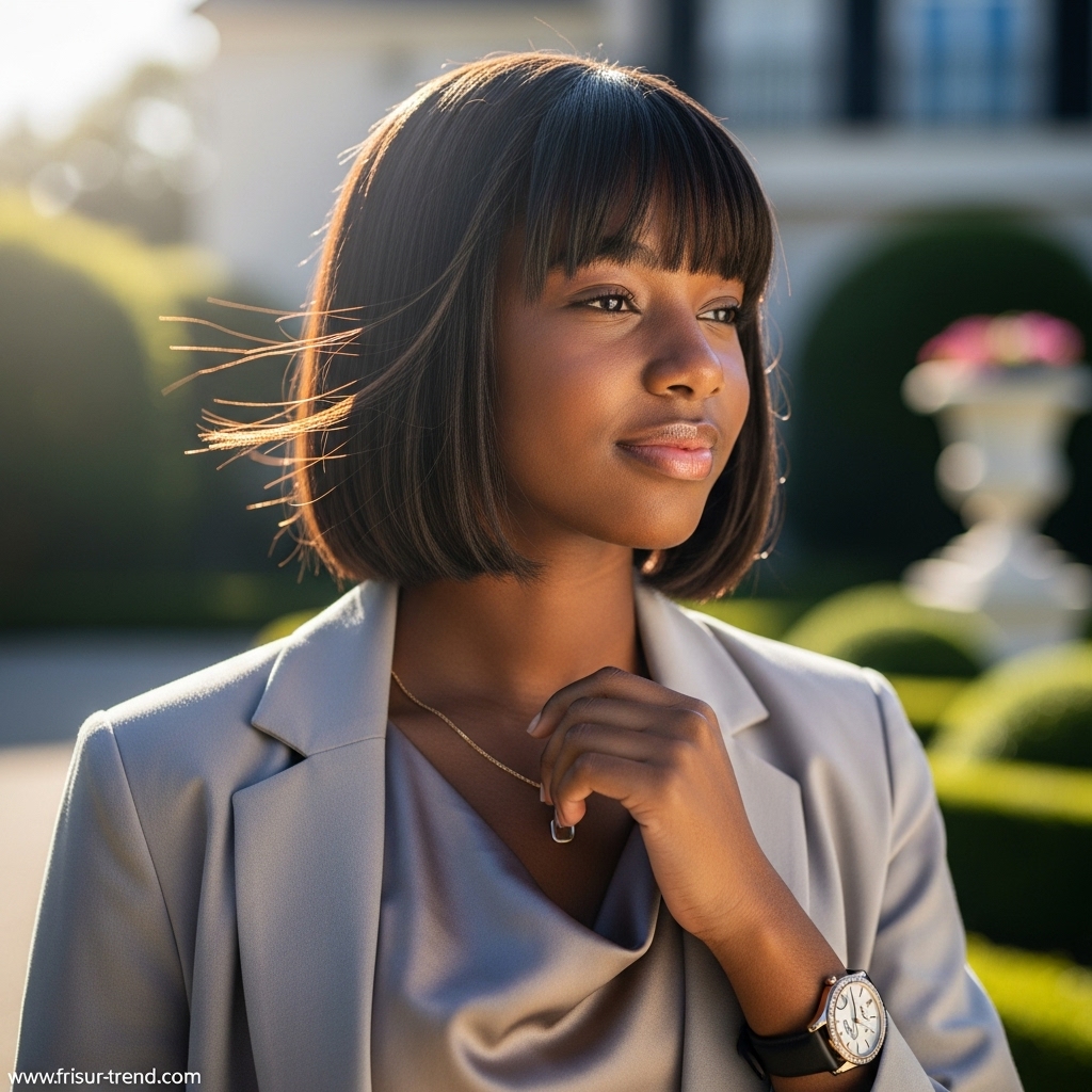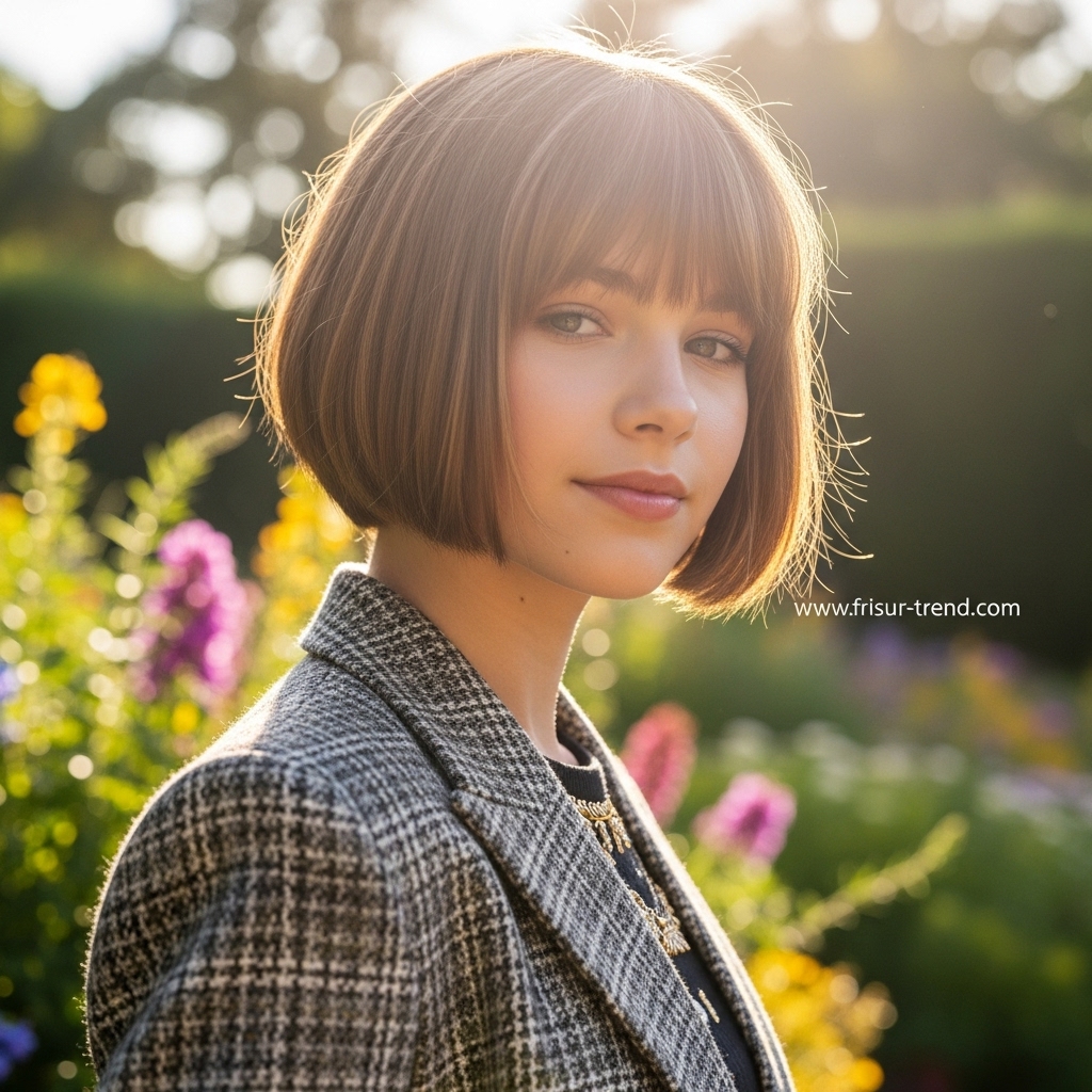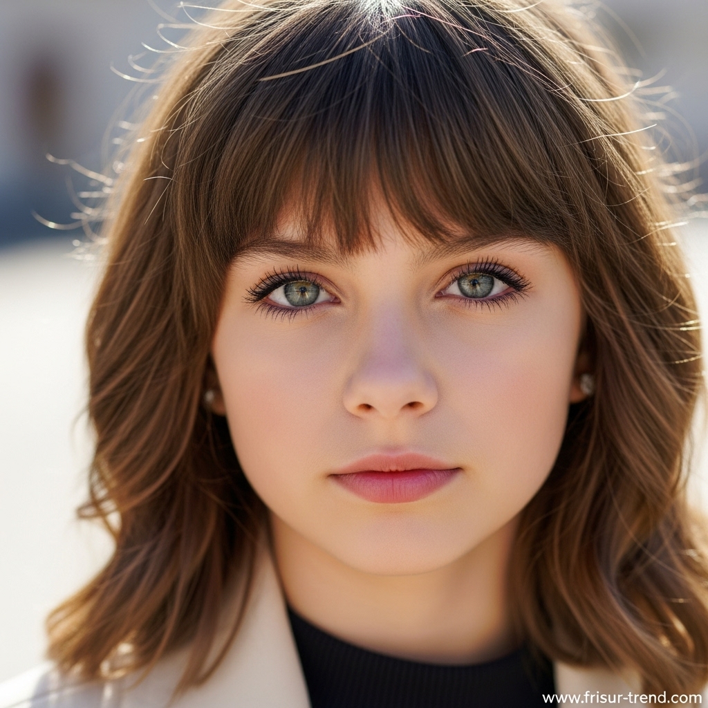 Der Pony rahmt das Gesicht sanft ein und bringt die Augen zum Strahlen. Es ist dieser subtile Mix aus NatĂŒrlichkeit und Raffinesse, der den Look so besonders macht.