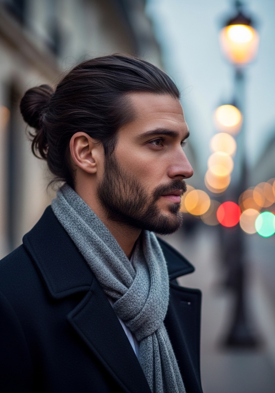 Ein absoluter Dauerbrenner: Der Dutt für Männer bleibt auch 2025 modern. Egal ob ganz oben auf dem Kopf oder tief im Nacken – der Man Bun ist praktisch und stilvoll zugleich.