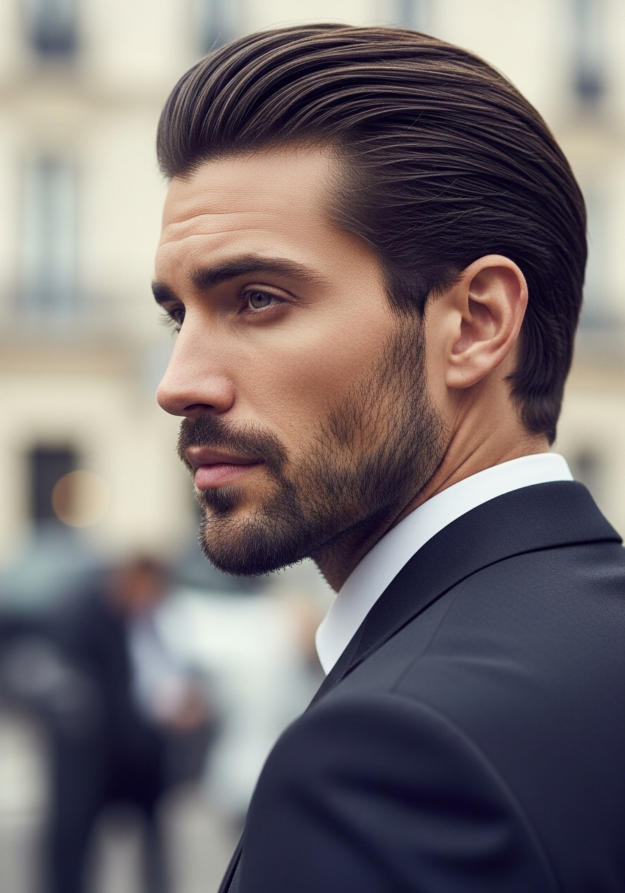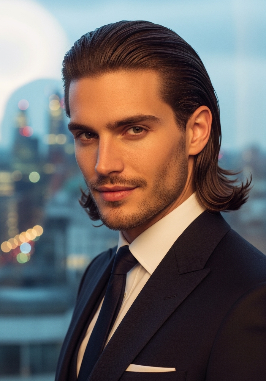 Wer es etwas eleganter mag, trägt sein langes Haar glatt und zurückgekämmt – ideal für Business, Events oder Dinner-Dates. Besonders in Kombination mit Bart entsteht ein starker, maskuliner Kontrast. 💼