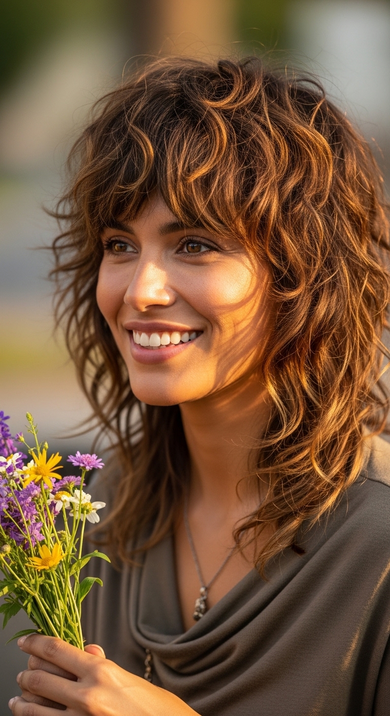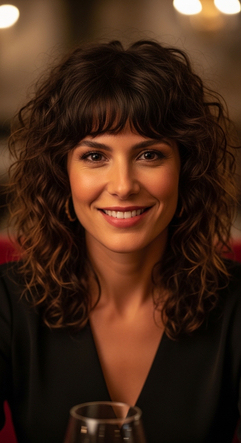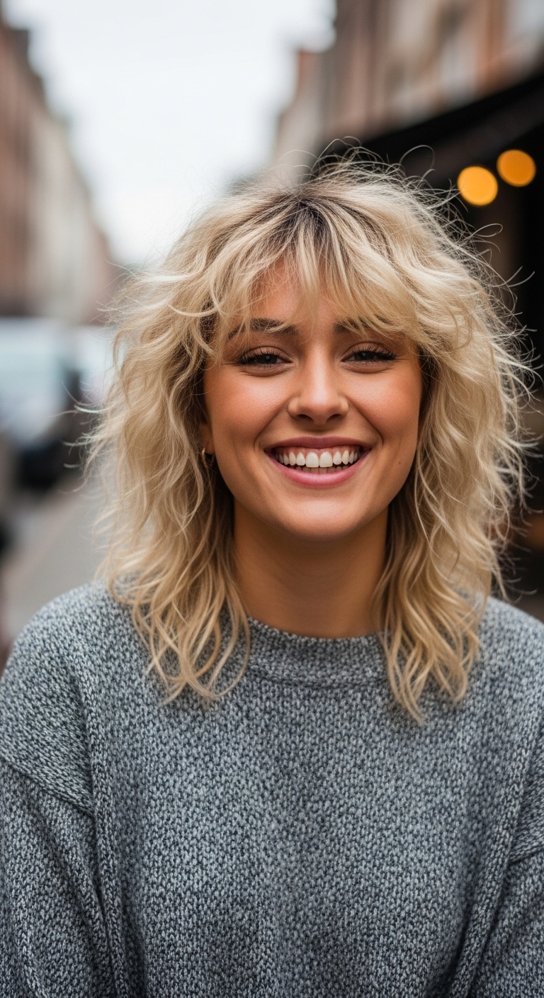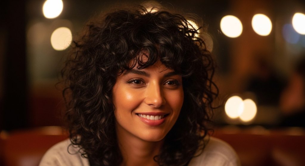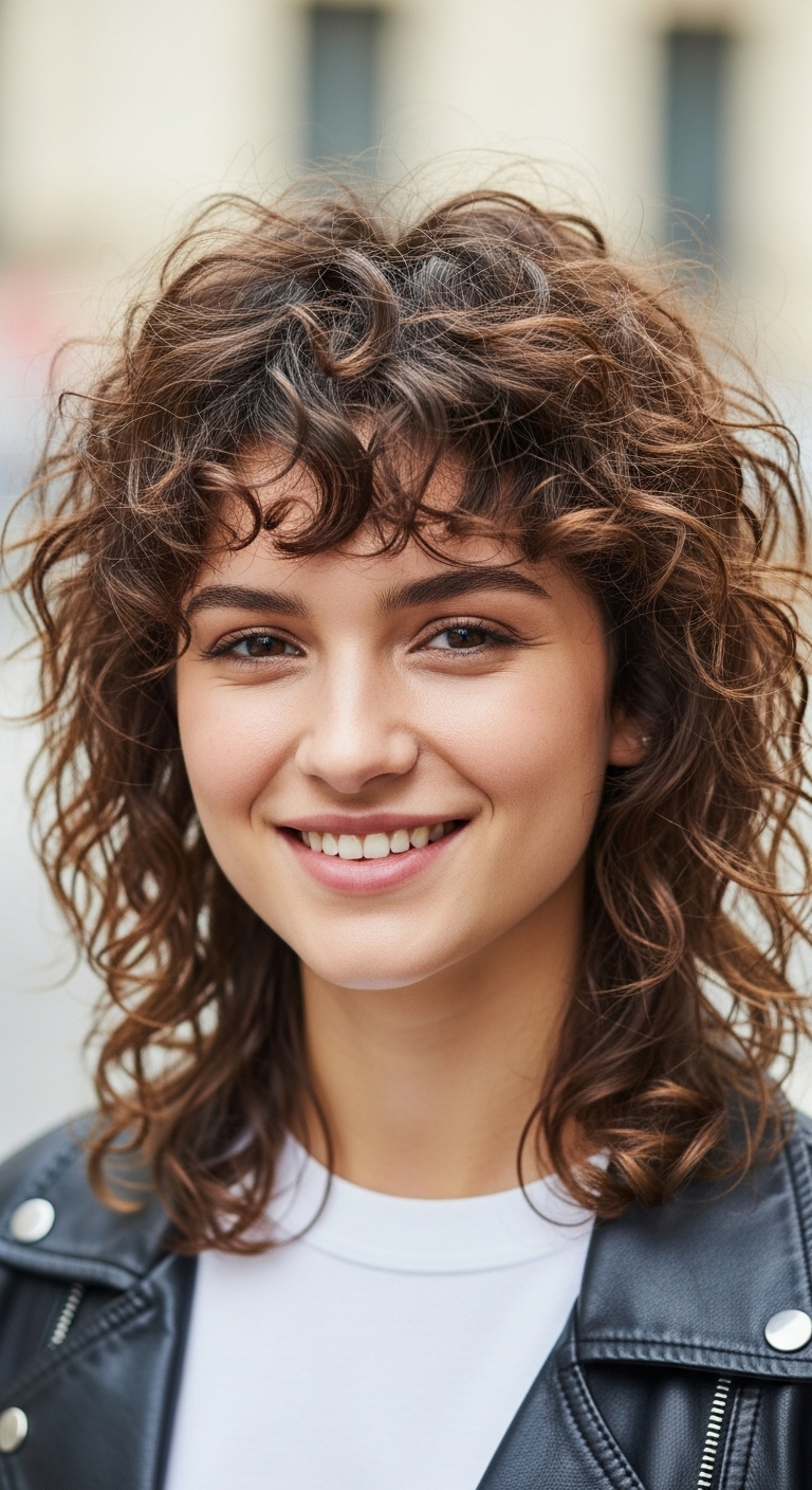Lockiger Pony ergänzt den Wolf Cut, rahmt das Gesicht ein und verleiht dem Look zusätzlich Ausdruckskraft.