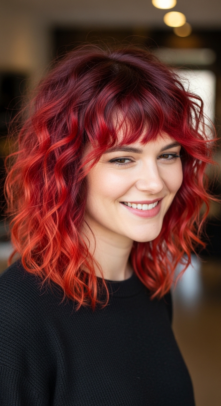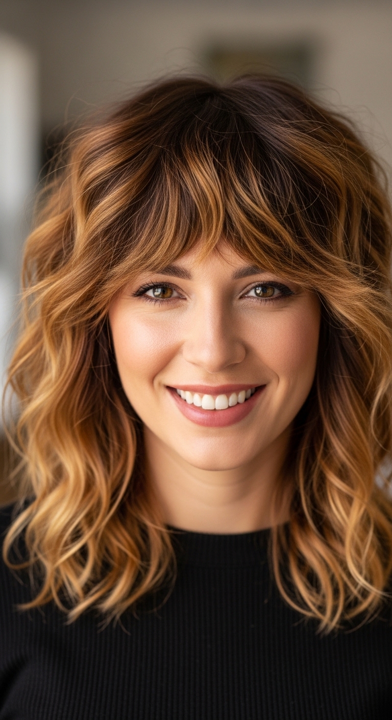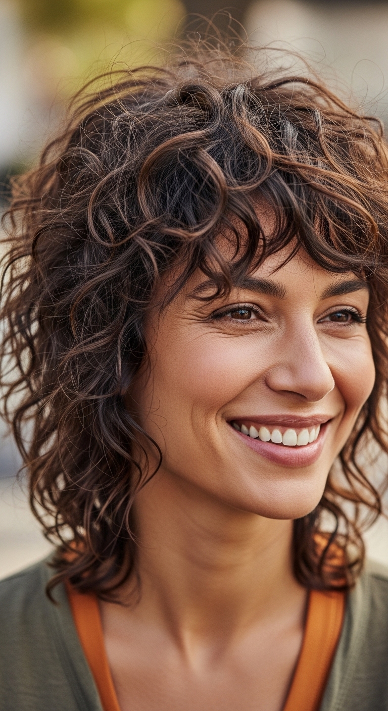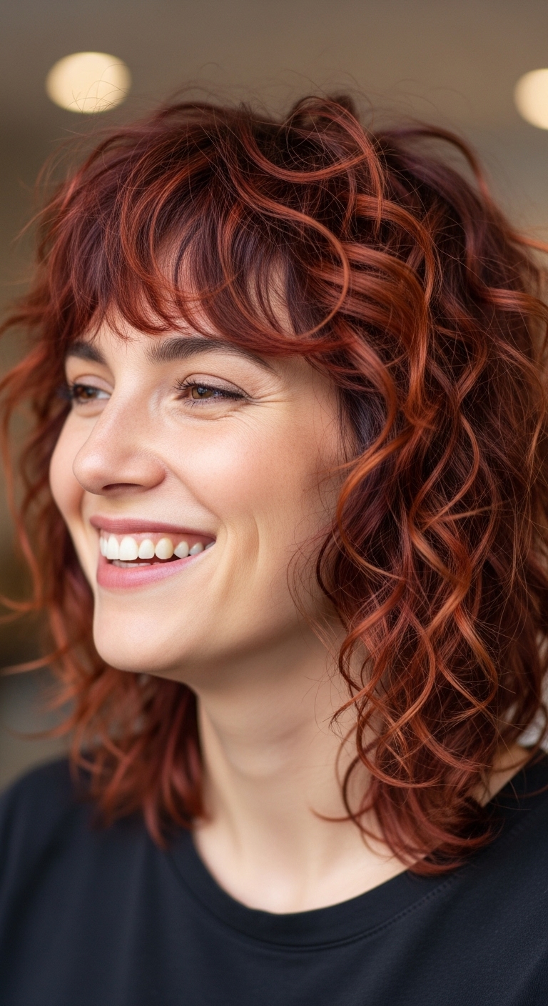 Lockiger Pony ergänzt den Wolf Cut, rahmt das Gesicht ein und verleiht dem Look zusätzlich Ausdruckskraft.