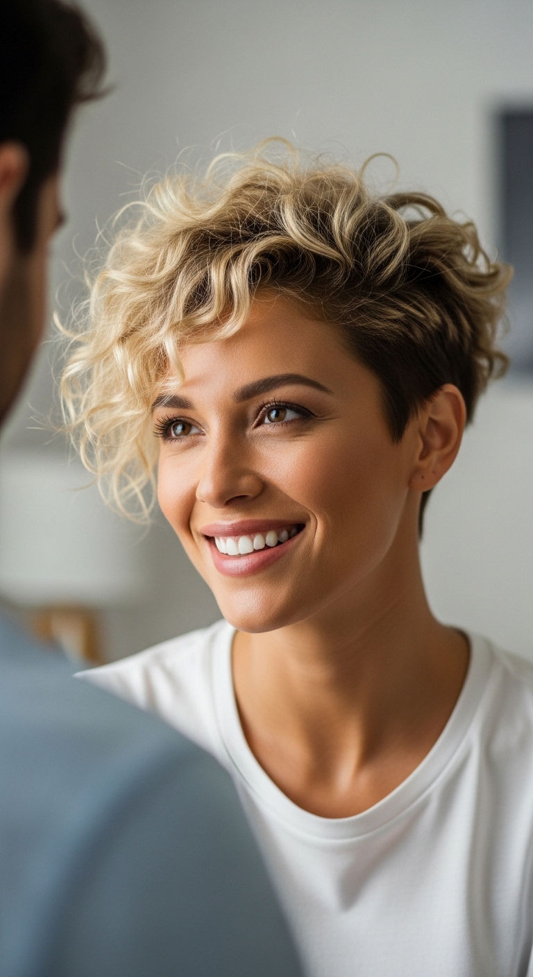 Extra kurze Locken erzeugen einen punkigen, jugendlichen Stil, der perfekt für selbstbewusste Persönlichkeiten ist.